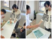 最初に、片栗粉と食紅を使って擬似ウイルスを作り、ハイタッチを通してどれだけ広がるかの実験を行いました。