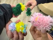 毛糸をくるくると巻き、はさみを入れてしっかり結び、広げて整えると、だんだんと丸くてふわふわな形が見えてきます。