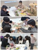 まずはグループに分かれ、容器の中に石や造花、草などを配置しながら、協力してひとつの作品を制作しました。